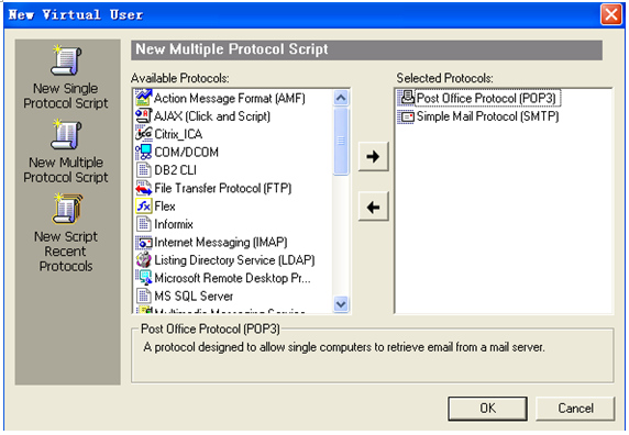 运行LoadRunner的脚本录制器VuGen,选择New Multiple Portocol Script双协议,同时选择POP3和SMTP两种协议进行录制,如图12-13所示。